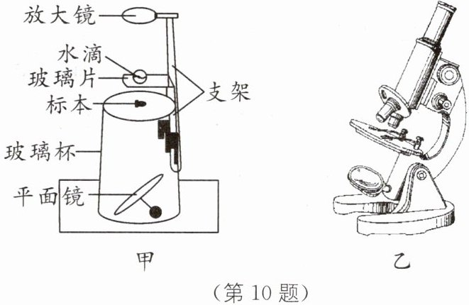 10 小华利用水滴、放大镜、平面镜、透明玻璃杯和可调支架等制作了一台“水滴显微镜”(如图甲所示).调节支架高度,适当调整标本、水滴和放大镜三者之间的距离实现了与如图乙所示光学显微镜相似的成像效果.