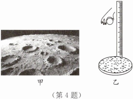 4 小军同学通过高倍望远镜观察月亮,发现月球表面是凹凸不平的,如图甲所示.这是由于流星在太空中运行到靠近月球时,在月球的引力作用下坠落到月球表面,与月球表面发生碰撞而形成的坑洞,叫作月坑.