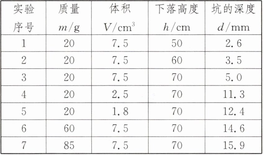 | 实验序号 | 质量m/g | 体积$V/cm^3 $| 下落高度h/cm | 坑的深度d/mm |