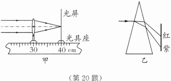 (3)小雷回想起白光经三棱镜后,光屏上自上而下出现了红、橙、黄、绿、蓝、靛、紫的色带(如图乙所示),受此启发,于是他分别用红光和蓝光来进行图甲的实验,结论是对同一凸透镜,______光入射时焦距小些.