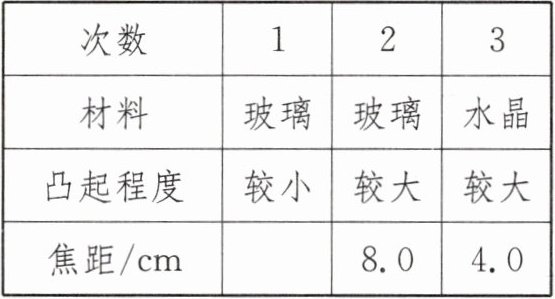 (2)由题图甲可知,第一次测得凸透镜的焦距为10.0cm,根据表中1、2次的实验数据可知,材料相同的凸透镜,凸起程度越大,其焦距越小。