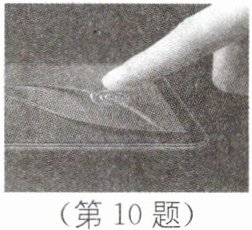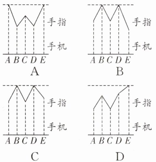 10 声波指纹识别在电子产品中很常用。放大手指局部,表面是凸凹不平的。如图所示是手机内置的声波指纹识别系统,手机发出的声波遇到手指上A、B、C、D、E五个位置,测得回收信号的时间分别为0.29ms、0.41ms、0.29ms、0.41ms、0.32ms,根据时间,求出手指与手机平面的距离,可绘出指纹的大致形状,则该处指纹的大致形状是( )。