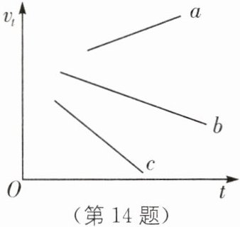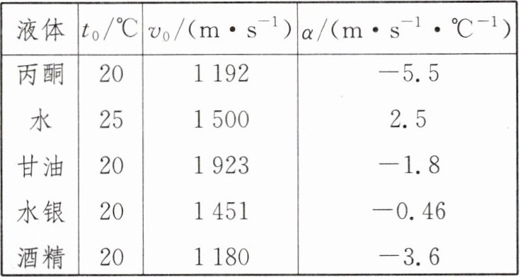 14 跨学科 一次函数的斜率 液体中的声速与温度有关,关系式为$v_{t}= v_{0}+\alpha(t-t_{0})$,其中:$v_{t}$表示温度为t时的声速,$t_{0}$为表格中指出的温度,$v_{0}表示温度为t_{0}$时的声速,$\alpha$为温度系数。