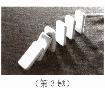 3. 新情境 多米诺骨牌 如图所示为多米诺骨牌.多米诺骨牌是一种用木制、骨制或塑料制成的长方体骨牌.玩时将骨牌按一定间距排列成行,轻轻碰倒第一张骨牌,其余的骨牌就会产生连锁反应,依次倒下.多米诺骨牌需要一张张摆下去,它不仅考验参与者的体力、耐力和意志力,而且还培养参与者的智力、想象力和创造力.多米诺骨牌竖着时,重心较高,倒下时重心下降,倒下过程中,将其______能转化为______能,它倒在第二张牌上,这个能量就转移到第二张牌上,将第二张牌推倒,如此传递下去.