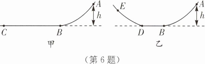 6. 提分优练(2023·泰州靖江期末)如图所示,一段粗糙程度相同的水平面和一个光滑的圆弧槽在B点处相连.质量为m的物体从离水平面高h的A点由静止释放,最后静止于水平面上的C点,BC长为3 m;如图乙所示,若在水平面上的D点处再连接一个光滑的圆弧槽,且BD长为0.7 m,物体从A点由静止释放,第一次到达左侧圆弧槽的E点,之后再下滑直至最终静止.图甲中,物体在BC段运动时,克服阻力做功,将动能转化为______能,直至动能为零;图乙中,最后物体静止于水平面上的位置距B点______m.