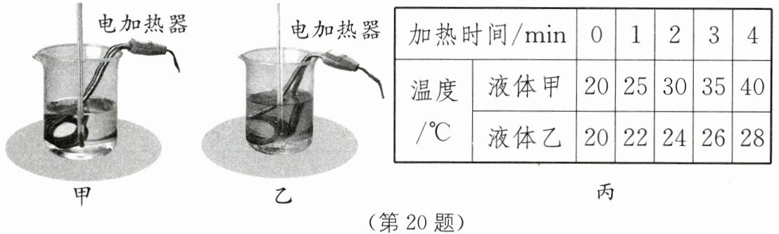 (1)根据比较吸热能力的方法,要控制不同物质的质量相同(不同物质密度一般不同,根据$m=\rho V$,体积相同两种物质质量可能不同),故实验前,应在两只烧杯中装入质量相同的液体甲和液体乙.