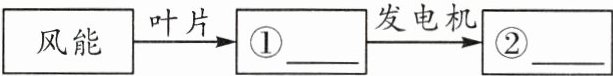 $\boxed{风能}\xrightarrow{叶片}\boxed{①}\xrightarrow{发电机}\boxed{②}$