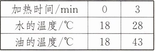 5. 用两只相同的电加热器,分别给相同体积的水和某种油加热,分别在开始和加热 3 min 时各记录一次温度,如下表所示。已知 $\rho_{水}= 1.0× 10^{3}\ kg/m^3$,$c_{水}= 4.2× 10^{3}\ J/(kg·℃)$,$\rho_{油}= 0.8× 10^{3}\ kg/m^3$,加热的效率都为 90%,油的末温没有达到它的沸点,则下列说法正确的是( )。