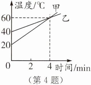 4. 甲、乙两物体质量之比是 4∶1,用两个相同的酒精灯分别给它们加热,设酒精灯放出的热量都被它们吸收,甲、乙两物体温度随时间变化的图像如图所示,若甲的比热容是 $0.4× 10^{3}\ J/(kg·℃)$,则乙的比热容是______。
