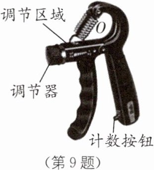 9 新情境 可调式握力器 如图所示为可调式握力器,锻炼时抓住左手柄,用力使其碰触右手柄上的计数按钮,完成一个握力动作,这个过程中左手柄拉动弹簧围绕连接点O旋转.握力器的力度通过旋转调节器移动弹簧下端的位置来改变,若将力度调小,则应将弹簧下端向______(填“左”或“右”)移.如果小明用平均大小为260 N的力抓握力器,使其在力的方向上移动6 cm,则做功为______J.