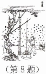 8 传统文化 桔槔打水 桔槔是一种原始的汲水工具,如图所示,横杆末端悬挂一个重物,前端悬挂水桶.水桶中有15 L的水,由图可以看出,桔槔本质上是一种______(填简单机械名称),在向上打水的过程中,桶升高了2 m,桔槔对水做的功是______J.使用同样的水桶一次打取更多的水时,为了更省力,不改变末端重物位置的情况下,其质量应适当______(填“变大”“不变”或“变小”).($g$取10 N/kg)