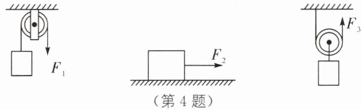 4 如图所示的三种场景中,拉力$F_1$、$F_2$、$F_3$大小相等,在拉力的作用下物体移动的距离相等.若拉力所做的功分别记为$W_1$、$W_2$、$W_3$,下列关于它们大小关系的判断中正确的是( ).