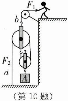 10. 小叶同学用如图所示的滑轮组提升重物A,不计绳重和机械之间的摩擦,每个滑轮的重力均为10 N,与地面固定的细绳a的拉力$F_2= 105\ N$,他通过细绳b用$F_1$的拉力将重物A匀速提升1.5 m,所用时间为10 s.下列说法中正确的是( ).