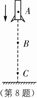 8. (2024·镇江中考)如图所示,某种可重复使用的火箭在降落过程中,通过控制推力,沿竖直方向先从A点减速运动到B点,再从B点匀速运动到C点,且AB= BC,不计运动过程中的空气阻力,忽略火箭质量的变化.则( ).