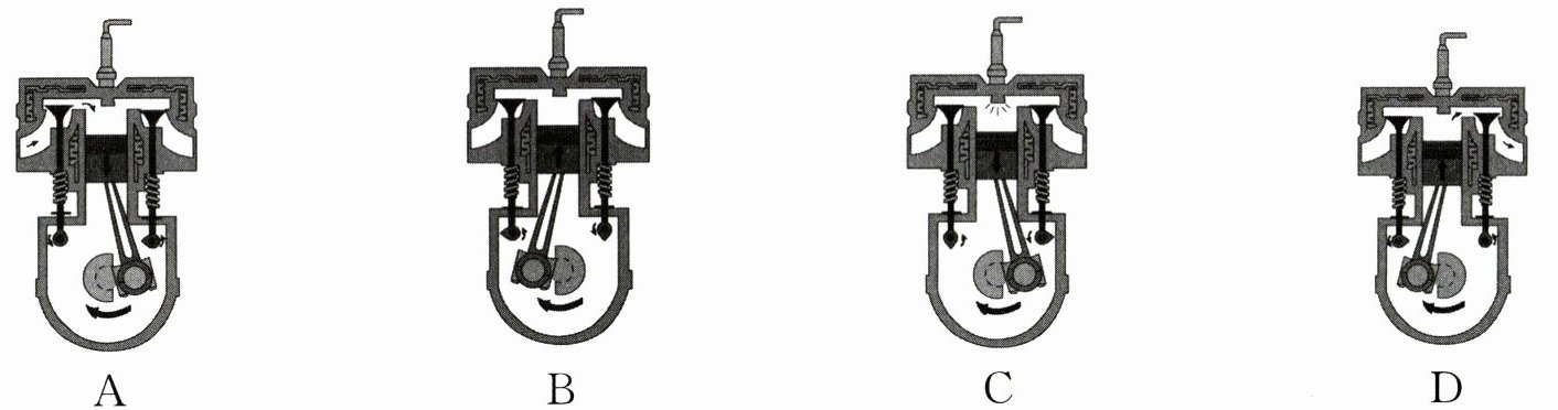 C [解析]本题考查对汽油机工作循环的认识。在汽油机的做功冲程中,进气门和排气门均关闭,活塞向下运动,故A、B、D错误,C正确。