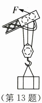 13. (2024·广东清远连州期末)在某大桥建设工地,起重机吊臂上的滑轮组如图所示.在大小为4000 N的拉力的作用下,重为$9×10^3\ N$的重物在10 s内匀速提升了5 m,重物上升速度是______m/s,起重机对重物做功为______J;这个过程额外功为______J.