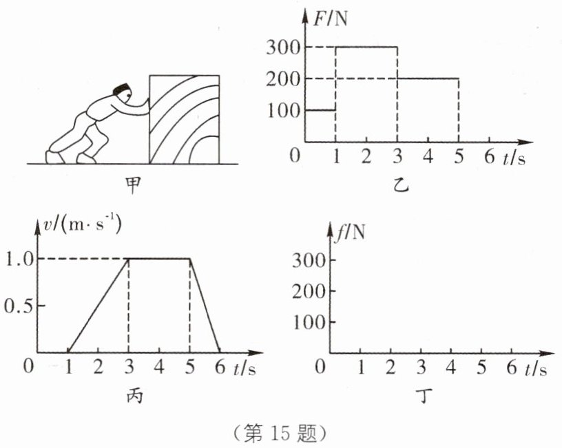 15 如图甲所示,水平地面上有一块密度为$0.5×10^{3}\ kg/m^3$、高为1.2 m的长方体木块.小林用水平推力$F$把木块向前推动,此过程中,推力$F和木块前进的速度v的大小随时间t$的变化情况分别如图乙、丙所示.