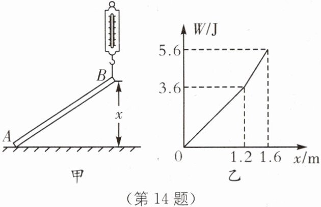 14 一根金属棒AB置于水平地面上,现通过弹簧测力计竖直地将棒的右端B缓慢拉起,如图甲所示.在此过程中,弹簧测力计对棒所做的功$W$和B端离开地面的高度$x$的关系如图乙所示.请根据图像解答下列问题.
