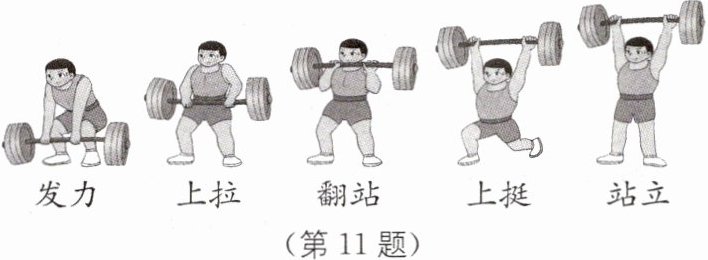 11 如图所示为一名举重运动员做挺举连续动作时的几个状态图.下列说法中正确的是( ).