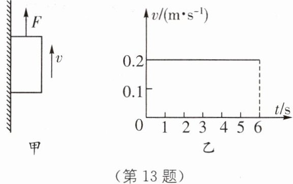 13 如图甲所示的铁块重力$G= 4\ N$,被吸附在竖直放置且足够长的磁性平板上,当它在竖直方向上拉力$F= 6\ N$的作用下向上运动,铁块此时速度$v与时间t$的关系图像如图乙所示,则铁块受到的摩擦力为______N,4 s内拉力$F$做的功是______J.
