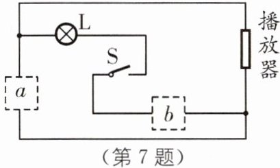 7. 提分优练(2024·无锡期末)如图所示是小红设计的定时闹钟音乐铃原理图。闭合开关S,“定时开关”到达设定时间时,所控制的播放器就能播放音乐。为了满足设计要求,应将“定时开关”接在虚线框______(填“a”或“b”)处,电源接在另一处;当播放器播放音乐时,“定时开关”处于______(填“闭合”或“断开”)状态,指示灯L______(填“能”或“不能”)发光。