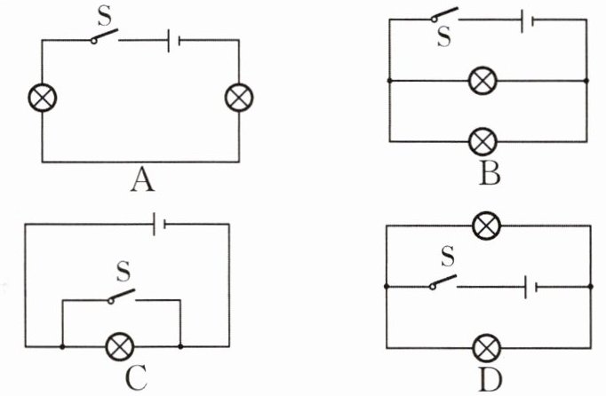 C [解析]在题图A中,开关闭合后,电流依次流过两个灯泡,两灯泡串联,不会发生短路,故A不符合题意;在题图B中,开关闭合后,电流分别流过两个灯泡,两灯泡并联,不会发生短路,故B不符合题意;在题图C中,闭合开关,灯泡被短路,不能发光,故C符合题意;在题图D中,开关闭合后,电流分别流过两个灯泡,两灯泡并联,不会发生短路,故D不符合题意.故选C.