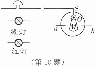 10. 某船上装有平衡警示电路,其中S为重力开关,金属片M可绕O点自由转动.当船水平时,M在a、b中间;当船左倾到一定程度时,绿灯亮、电铃响;当船右倾到一定程度时,红灯亮、电铃响.请完成电路图.