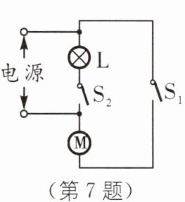 D [解析]开关S₁闭合、S₂断开时,电路为电动机的简单电路,照明灯不工作,电动机工作,故A错误;开关S₁、S₂都闭合时,照明灯L与电动机M并联在电源的两极之间,故B错误;S₂控制照明灯,故关上冰箱门时,S₂自动断开,照明灯熄灭,故C错误;S₁控制电动机,冰箱内温度降低到设定温度时,S₁自动断开,电动机停止工作,故D正确.