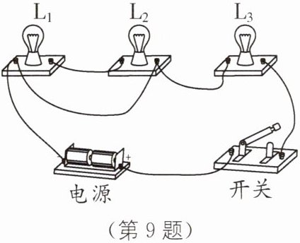 9. 如图所示是某同学利用老师的磁吸式电学器材在磁性黑板上组装电路时的一张照片,已知$L_1、$$L_2$都没有损坏,现在当开关闭合后只有$L_3$发光.请你用笔画线添加一根导线改造电路,要求:让三盏灯都能亮起来.