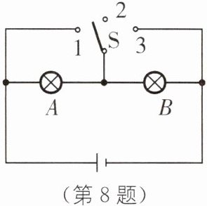 C [解析]题图中S为单刀三掷开关,当开关S与1接触时,电路为灯B的简单电路,灯A被短路,所以灯B亮,故A错误;当开关与2接触时,A、B两灯串联,所以灯泡A、B都亮,故C正确,B、D错误.故选C.