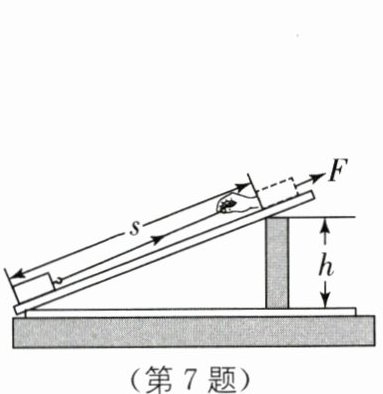 7. 如图所示的斜面长s= 8 m,高h= 1 m,工人用绳子在6 s内将重为500 N的物体从其底端沿斜面向上匀速拉到顶端,拉力是150 N(忽略绳子的重力).则下列说法正确的是( ).