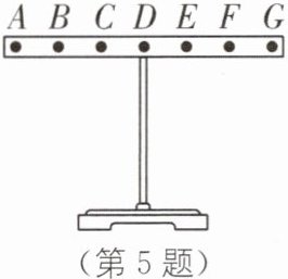 5. 在杭州市第36届青少年科技创新大赛上,一位同学展示了如图所示的“硬币玩转杠杆”装置,活动中使用的硬币完全相同.在刻度均匀的杠杆上放硬币之前,杠杆已在水平位置平衡,说明该杠杆的重心在______点.在A点叠放两枚硬币时,则可在E点叠放______枚硬币能使杠杆保持水平平衡.保持A点叠放两枚硬币不变,在杠杆上已标出的其余6个点上放硬币,有些点无论放多少枚硬币都无法使杠杆保持水平平衡,这些点是______.