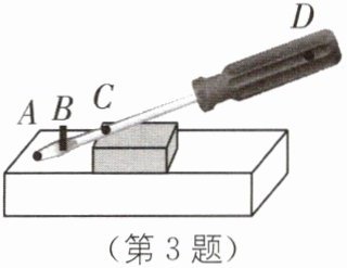 3. 如图所示,用螺丝刀撬骑马钉B,若用力往下撬时,其支点位于图中的C点,它是______(填“省力”或“费力”)杠杆.若用力往上撬时,其支点位于图中的A点,且后者比前者______(填“省力”或“费力”)些.