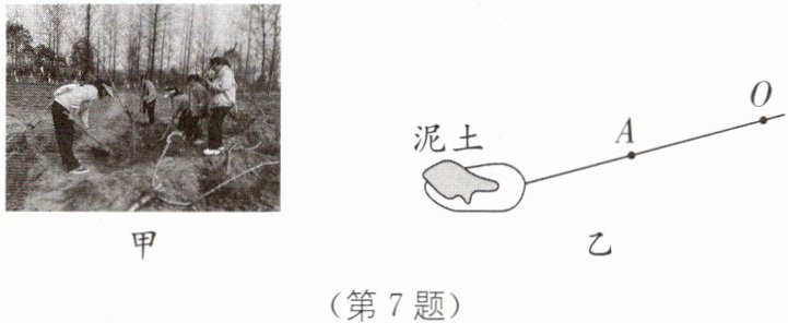 7. 提分优练(2023·成都中考)植树节当天,学校初二年级开展植树活动.同学们分工合作,如图甲所示,小高正在用铁锹铲土.将铁锹视为杠杆,O为支点,请在图乙中画出:(1)手在A处施加的最小动力$F$的示意图;(2)$F的力臂l$.