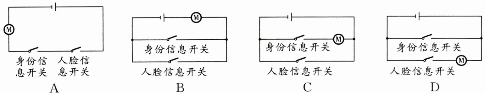 A [解析]本题考查串、并联电路的设计.由题意可知,当身份信息和人脸信息都符合,即两个开关都闭合时,电动机转动;图A中,只有两个开关均闭合时电动机才工作,故A符合要求;图B中,闭合任何一个开关时电动机都工作,故B不符合要求;图C中,只要闭合人脸信息开关,电源就短路,故C不符合要求;图D中,只要闭合身份信息开关,电源就短路,故D不符合要求.