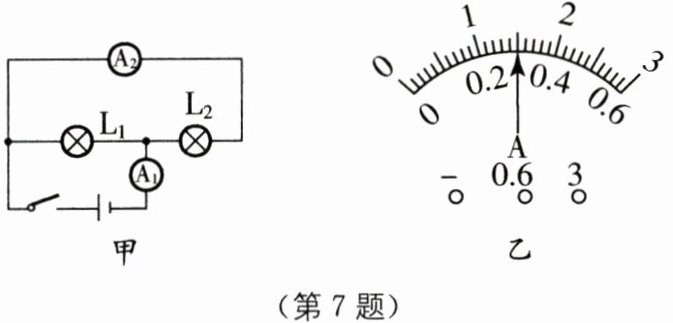 7. 如图甲所示的电路中闭合开关后,两个灯泡都能发光,电流表$A_1、$$A_2$指针的位置均如图乙所示,下列说法正确的是( ).