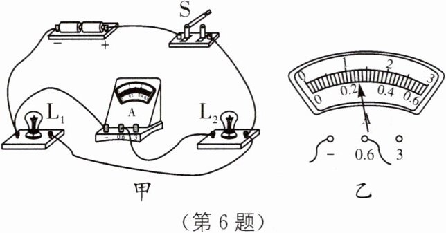 6. 小明连接了如图甲所示的电路,当开关S闭合后,电路正常工作,电流表指针偏转如图乙所示,下列关于该电路说法正确的是( ).