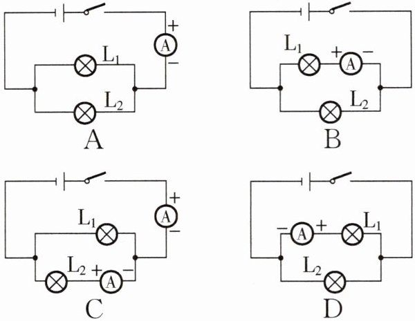 5. 下列电路图中,能正确测量通过灯$L_1$电流的电路是( ).