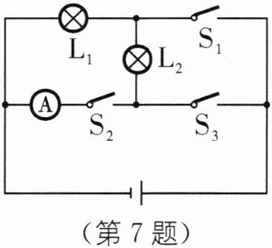 B.当$S_1、$$S_2、$$S_3$都闭合时,灯$L_1、$$L_2$全亮,电流表测$L_2$中的电流