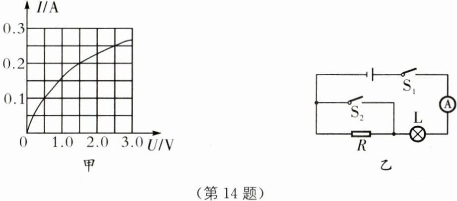 14. (2023·淄博中考)小灯泡的I-U图像如图甲所示,将它与定值电阻R接入图乙所示的电路中.只闭合开关$S_1,$电流表的示数为0.2 A;再闭合开关$S_2$时,电流表的示数为0.25 A.则电源电压为______V;只闭合开关$S_1$时,电阻R两端的电压为______V.