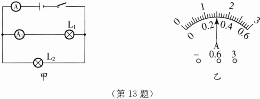 13. 如图甲所示的电路中,闭合开关,两灯泡均发光,且两个完全相同的电流表指针偏转均如图乙所示,通过灯泡$L_1$的电流为______A,通过灯泡$L_2$的电流为______A.