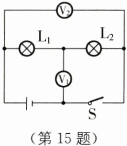 15. 如图所示,闭合开关S,电压表$V_1$测量的是______的电压,电压表$V_2$测量的是______(前两空填$“L_1”“L_2”$或$“L_1$和$L_2”)$的电压.若再断开开关S,电压表$V_1$的示数将______(填“变大”“变小”或“不变”).
