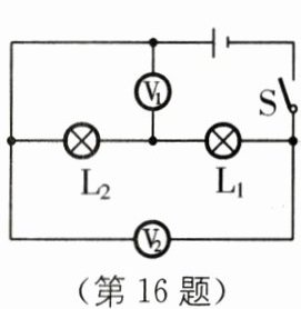 16. 如图所示,闭合开关S后,电压表$V_1$和$V_2$的示数之比为1∶4,已知$V_1$的示数是2 V,则灯$L_1$两端的电压是______V,电源电压是______V.