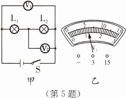 5. 如图甲所示,当开关闭合后,两灯都发光,此时$V_1、$$V_2$的示数均如图乙所示,则电源电压为______V,灯$L_1$两端的电压为______V,灯$L_2$两端的电压为______V.