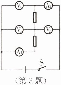 3. 如图所示电路中,闭合开关,电压表$V_1、$$V_2、$$V_3$示数分别为$U_1、$$U_2、$$U_3,$电流表$A_1、$$A_2$示数分别为$I_1、$$I_2,$电路均无故障,那么下列关系式正确的是( ).