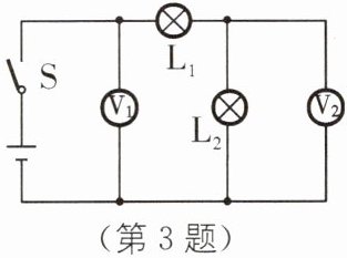 B [解析]根据电路图可知,电流的路径只有一条,是串联电路,电压表V₁测量的是电源电压,电压表V₂测量的是灯泡L₂两端的电压;根据串联电路的电压规律可知,两电压表示数不同,且电压表V₁的示数大于V₂的示数.故B正确,A、C、D错误