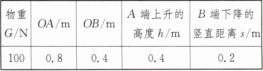 |物重 G/N|OA/m|OB/m|A 端上升的高度 h/m|B 端下降的竖直距离 s/m|