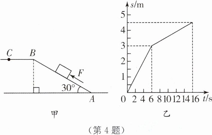 4 工人用沿斜面向上,大小为 500 N 的推力 F,将质量为 80 kg 的货物从 A 点匀速推至 B 点;再用 100 N 的水平推力$ F_1$使其沿水平台面匀速运动到 C 点;图乙为物体从 A 点经 B 点到达 C 点的 s-t 图像.(g 取 10 N/kg)求: