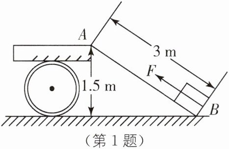 1 一辆卡车的车厢底板距地面高度为 1.5 m,小军把 3 m 长的钢板 AB 搭在车厢底板上,构成一个如图所示的斜面,他沿着斜面方向用 500 N 的力,把一个木箱从 B 处推到 A 处,已知木箱重为 800 N,推木箱的时间是 50 s,在这一过程中斜面的机械效率是______.