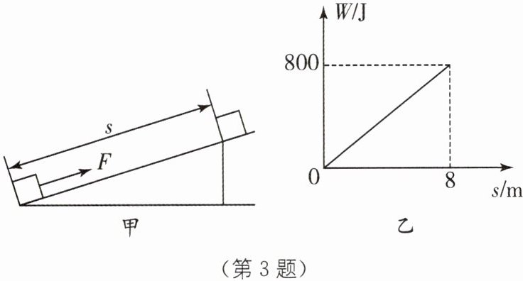 3 一个木箱重为 400 N,工人用沿斜面向上的拉力 F 将木箱匀速拉到高处,如图甲所示.整个过程中拉力 F 做的功 W 与木箱沿斜面运动距离 s 的关系如图乙所示,整个过程的额外功是 160 J,则拉力 F= ______N,斜面的机械效率 η= ______,木箱受到斜面的摩擦力 f= ______N.